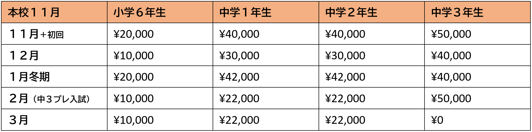 <本校> 11月ご入会時の年間費用です。4月からの年間費用はこちらをご覧ください。