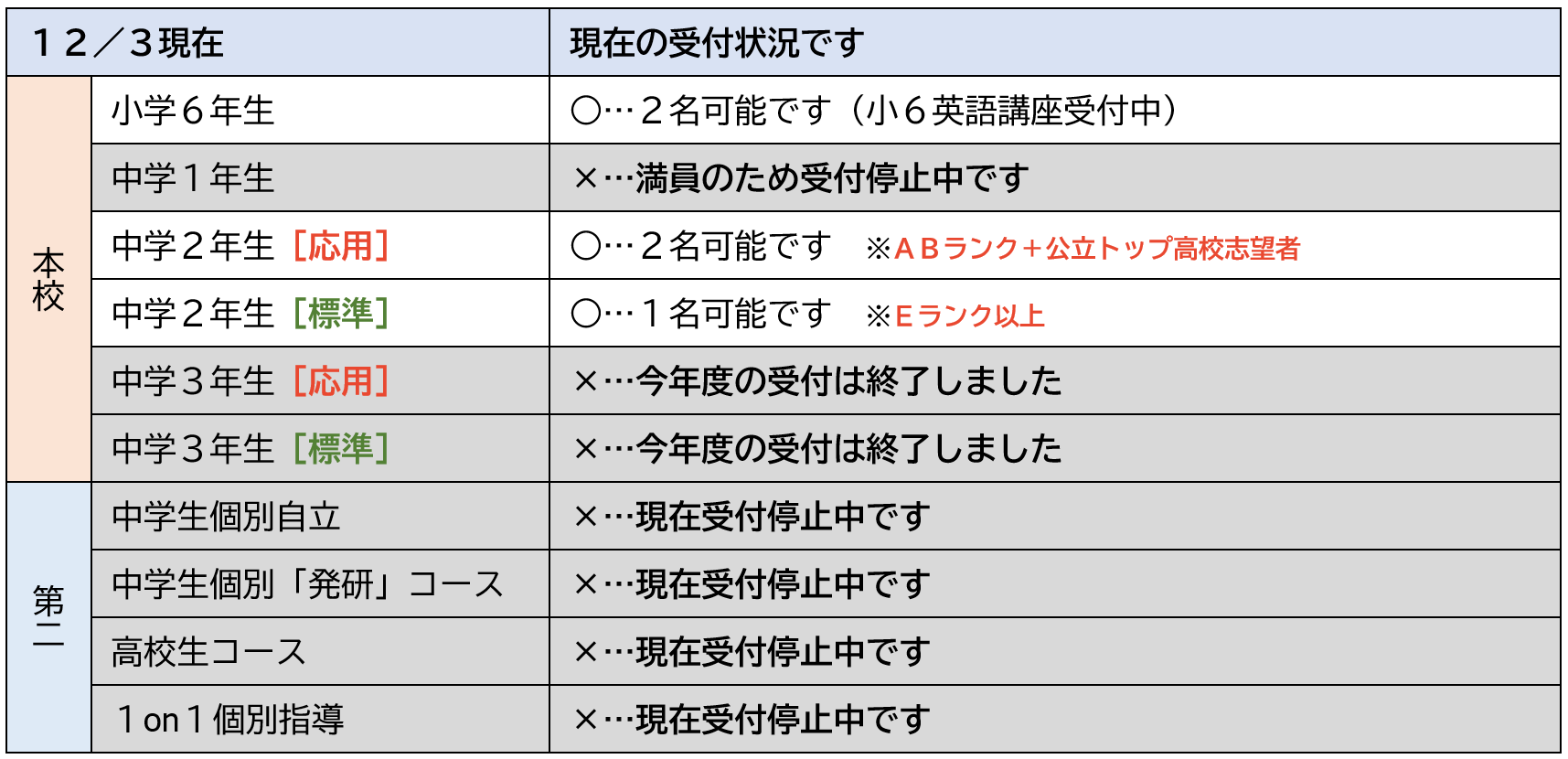 ・中1は今後応用/標準の2クラス体制になる予定ですが、標準クラスは受付しないかもしれません。ご了承ください。