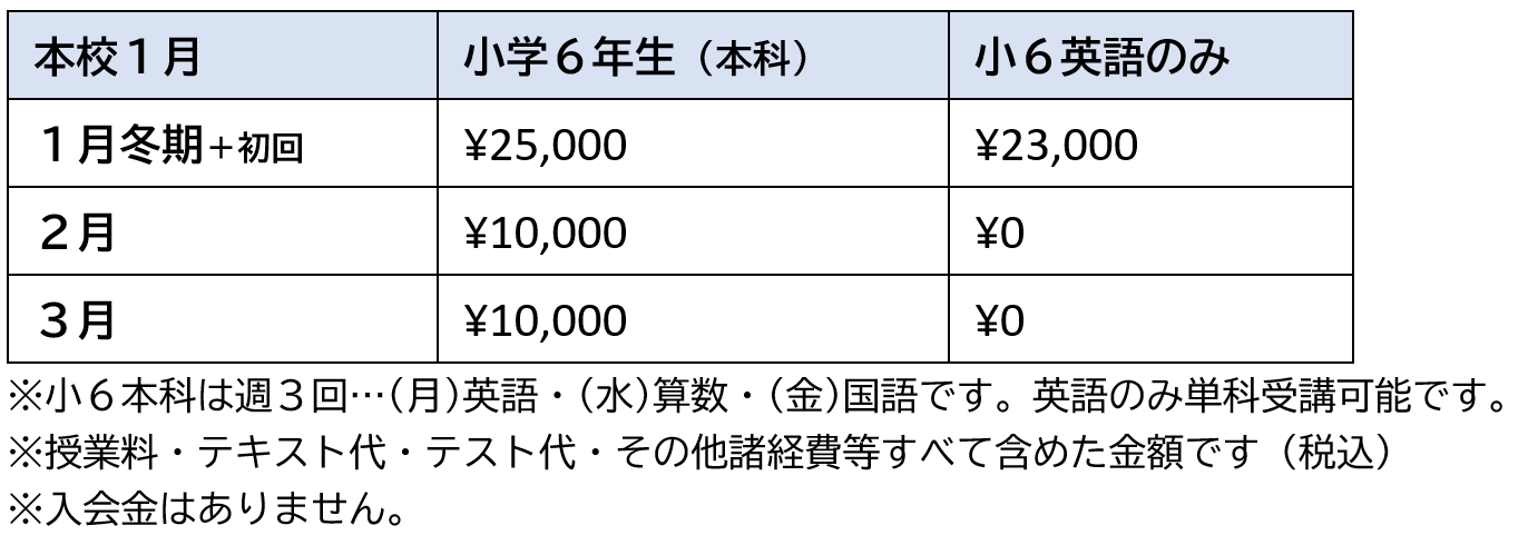 <本校> 1月ご入会時の年間費用です。4月からの年間費用はこちらをご覧ください。