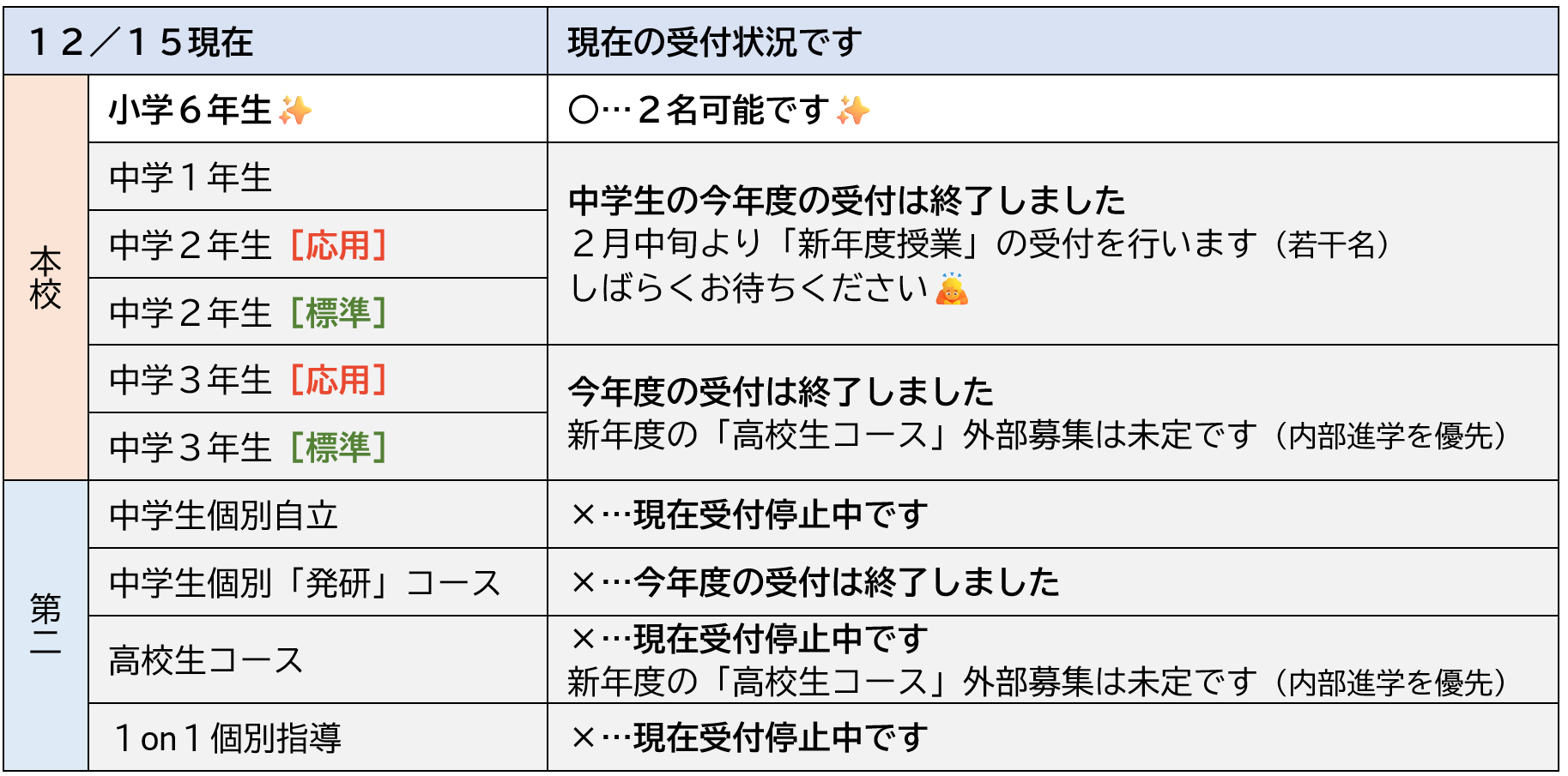 ・新年度概要は12月中にお知らせ予定です。新中2は応用/標準の2クラスになります。